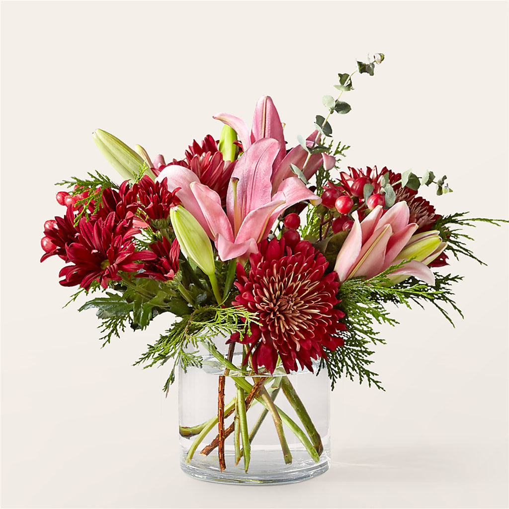 This gift arrives at their doorstep blooming with red mums, daisies, and pink lilies to make their day as sweet as your favorite Christmas cookies.